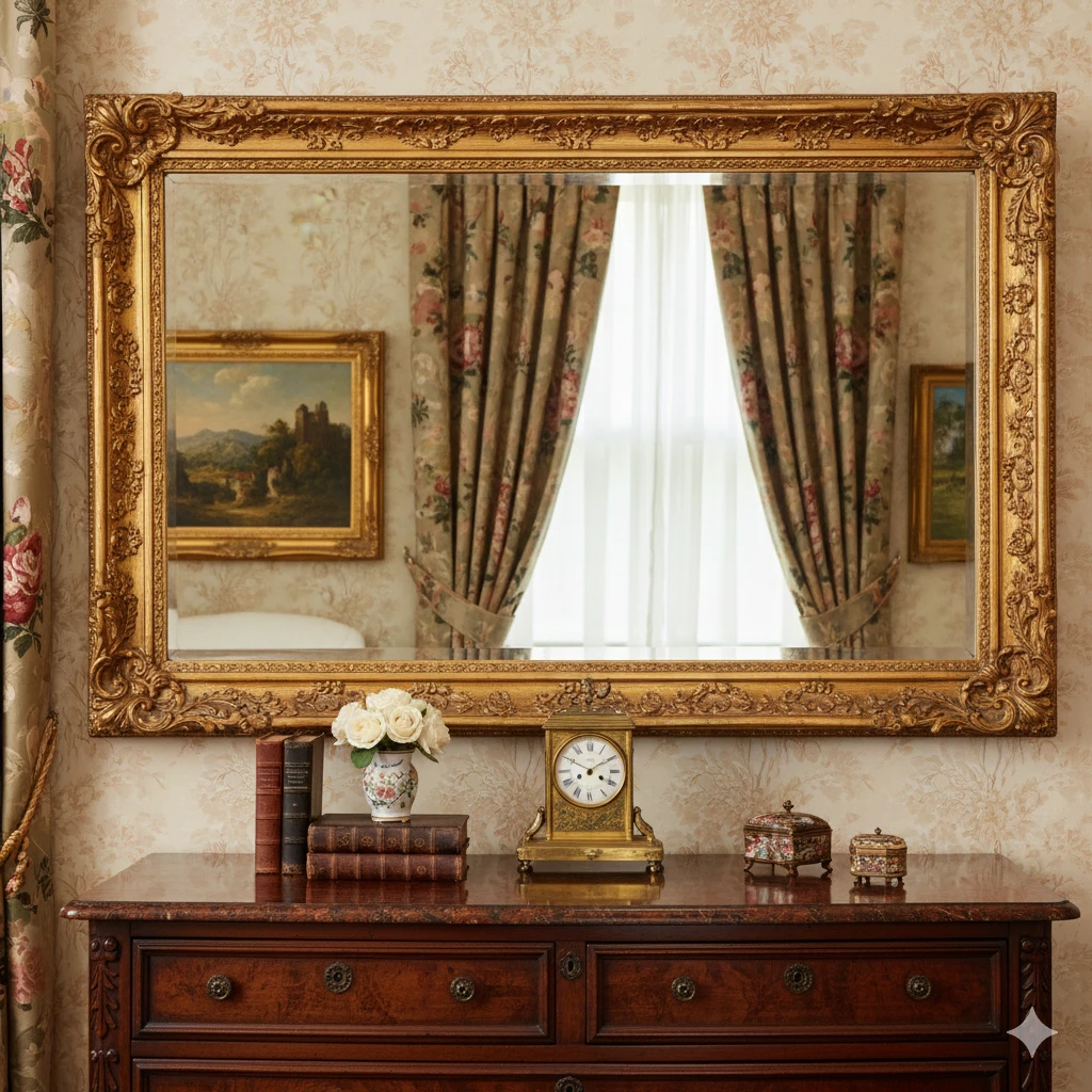 Mirrors reflect light and enlarge rooms. Ornate gold frames fit the theme. Place opposite windows.