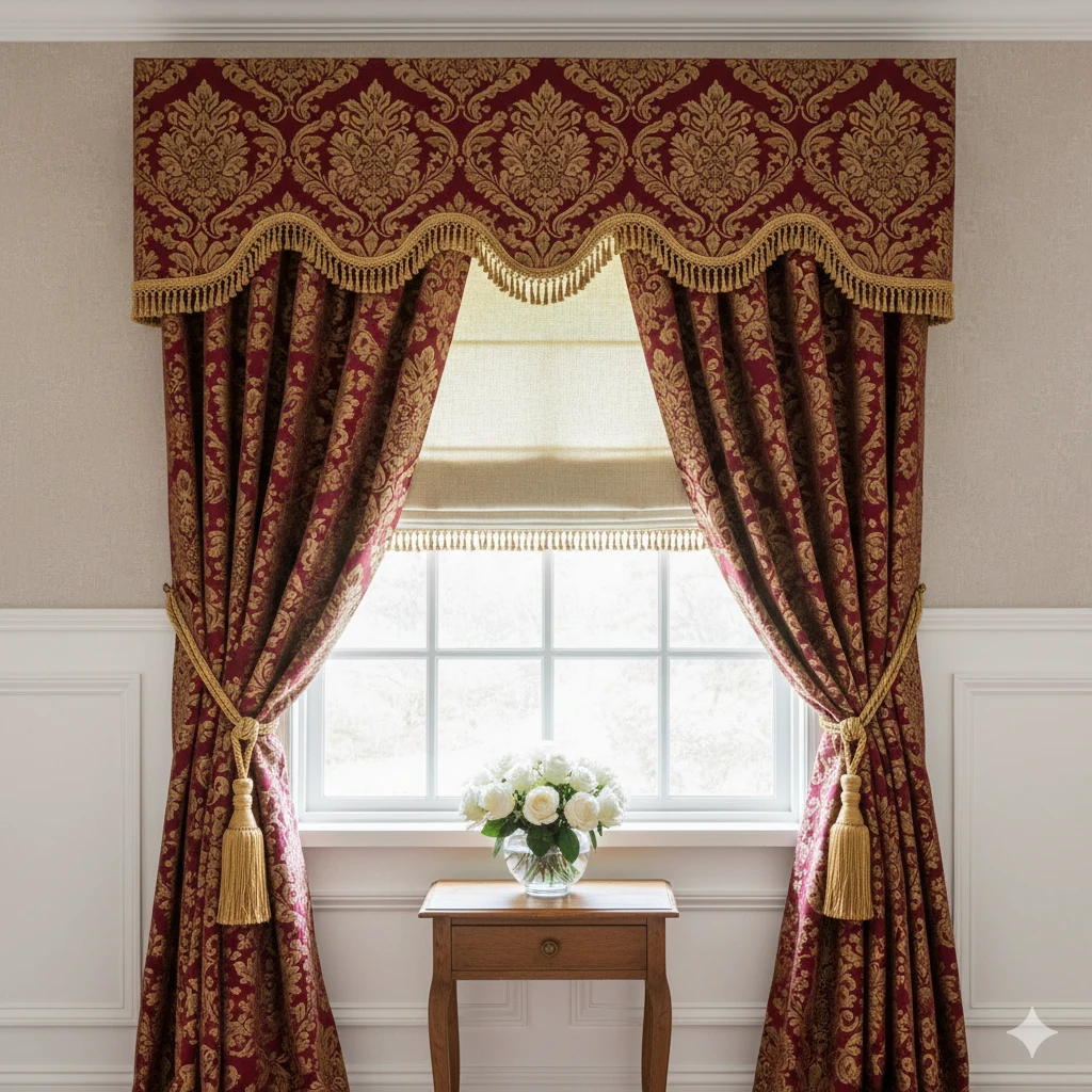 Valances top curtains for polish. Scalloped edges add whimsy. Match fabrics to bedding.