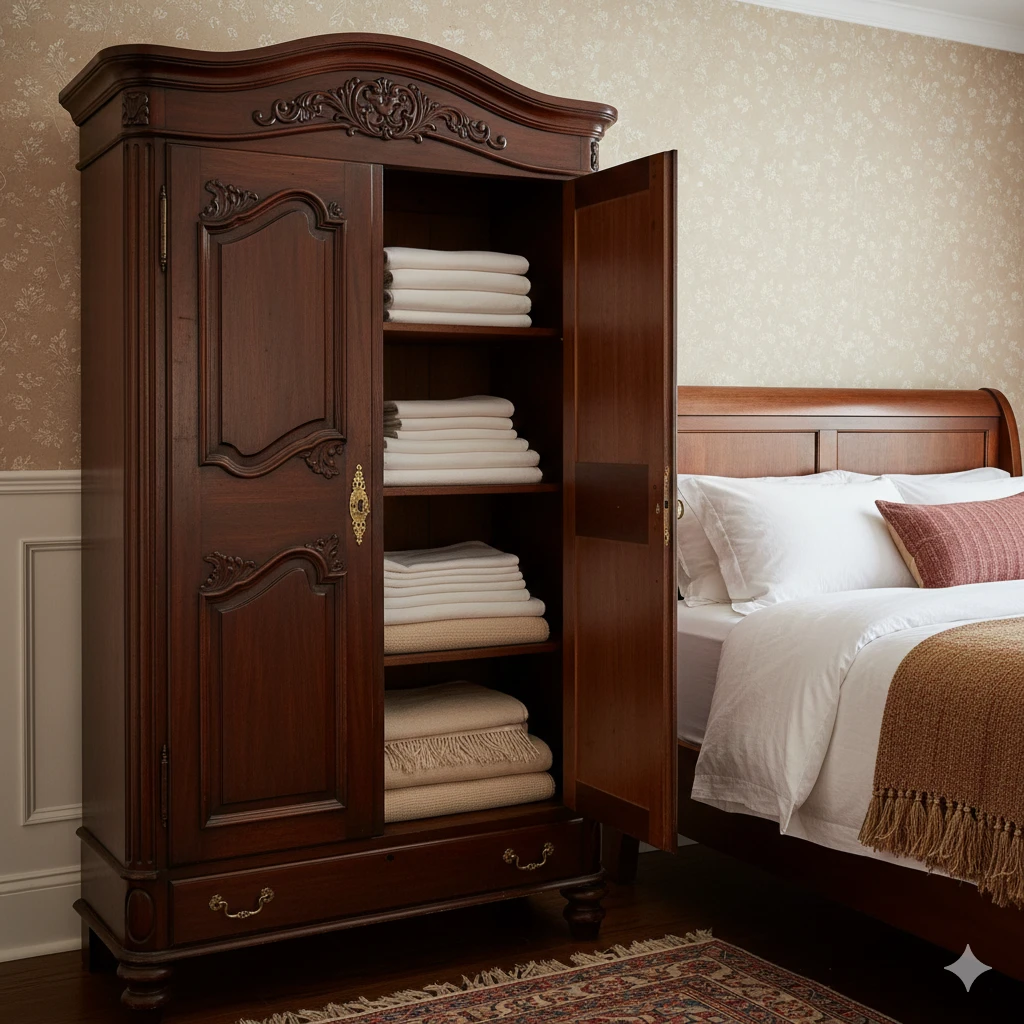 Storage keeps tradition tidy. Armoires hide clothes beautifully. Carved ones double as focal points.