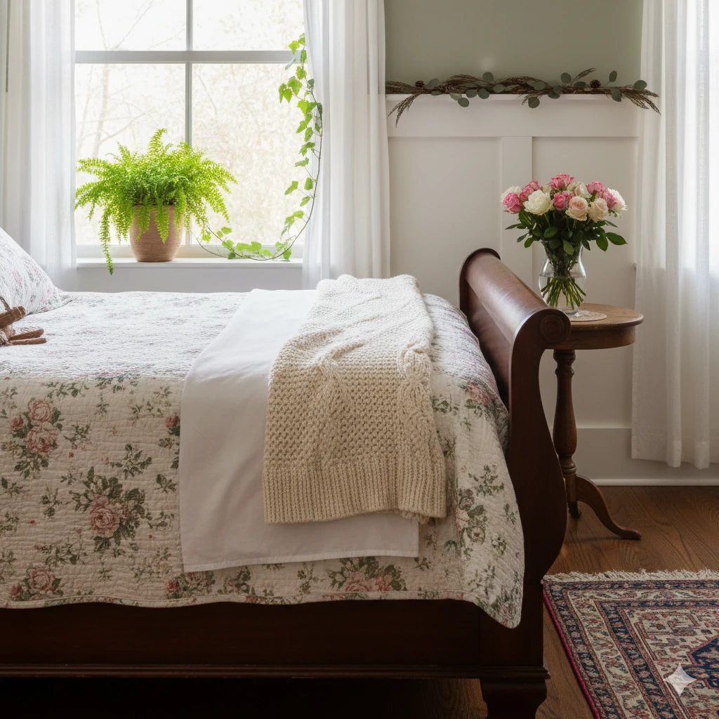 Bedding turns a bed into a sanctuary. Layer with quilts in floral patterns. They add texture and history.